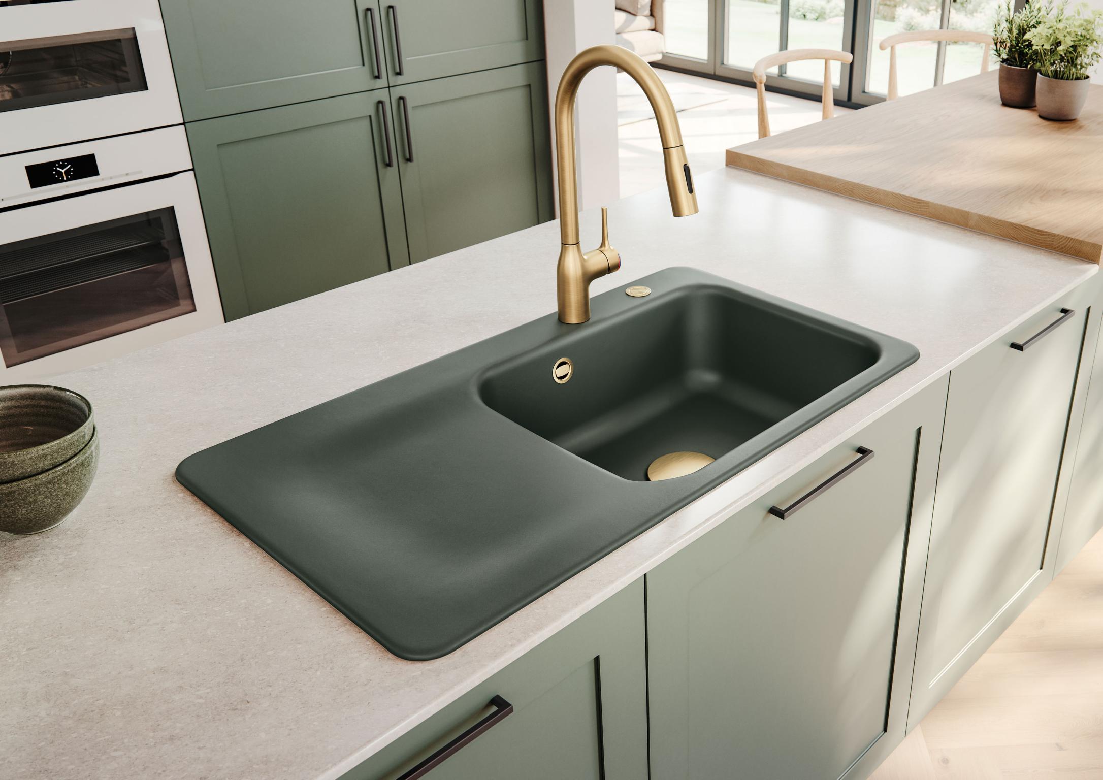 Erhältlich sind die Modelle für den 60 und 50 cm breiten Spülenschrank, als Einbauspüle und in der flächenbündigen Variante. Zur Wahl stehen aktuell 15 Keramikfarben aus glänzenden und matten Glasuren von reinem Weiß bis Tiefschwarz. Jüngster Neuzugang ist die Glasur „Eibe“, ein mattes Dunkelgrün, das sich als Kombinationspartner für Holz- und Naturtöne empfiehlt und sehr gut mit mattschwarzen und metallischen Optiken harmoniert. Weitere natürliche Farbtöne sind auch „Jasmin“, „Fango“, „Schiefer“ oder „Lava“.