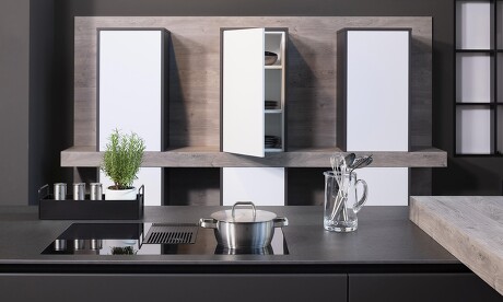 Eine kubistische Gestaltung prägt diese Komposition aus symmetrisch gehängten grifflosen Küchenschränken, die sich auf Antippen öffnen. Die sechs weißen Hängeschränke wirken vor der auf Schwarz aufliegenden Holzrückwand wie drei skulpturale Designobjekte, umrahmt von Regalfachreihen im japanischen Shoji-Style. Stauraumschaffung steht für Liebhaber solchen Küchendesigns nicht im Vordergrund. Hier geht es um puristische Ästhetik in einer auf das Wesentliche reduzierten Formensprache.