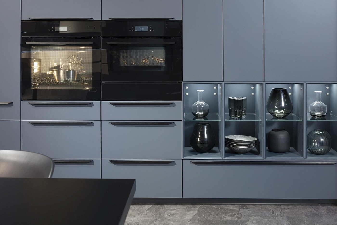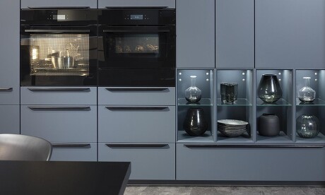 Die gewachsene Gestaltungsfreiheit bei Küchenfronten macht’s möglich: Wir kombinieren Mattlackfronten in Wunsch-Farbton und -Maß mit Glasschränken, in denen – entsprechend illuminiert – schöne Gefäße nicht mehr verborgen bleiben. Glasböden intensivieren diese effektvolle Beleuchtung, die der gesamten Schrankwand ein sehr wohnliches, feines Ambiente verleiht. Der Clou ist nicht zuletzt die unübliche Position im unteren Drittel, leicht versetzt zu den schwarz verglasten Einbaugeräten. Diese besondere Glas-Fronten-Zusammenstellung nimmt den Einbaugeräten viel von ihrem Küchencharakter. Umso wohnlicher wirkt diese Gestaltung. Die im Unterschied zu den übrigen Fronten grifflose Ausführung der schmalen Schranktüren oberhalb der integrierten Vitrine schafft einen glatten Horizont im wirkungsvollen Übergang zu den Schaukästen darunter.