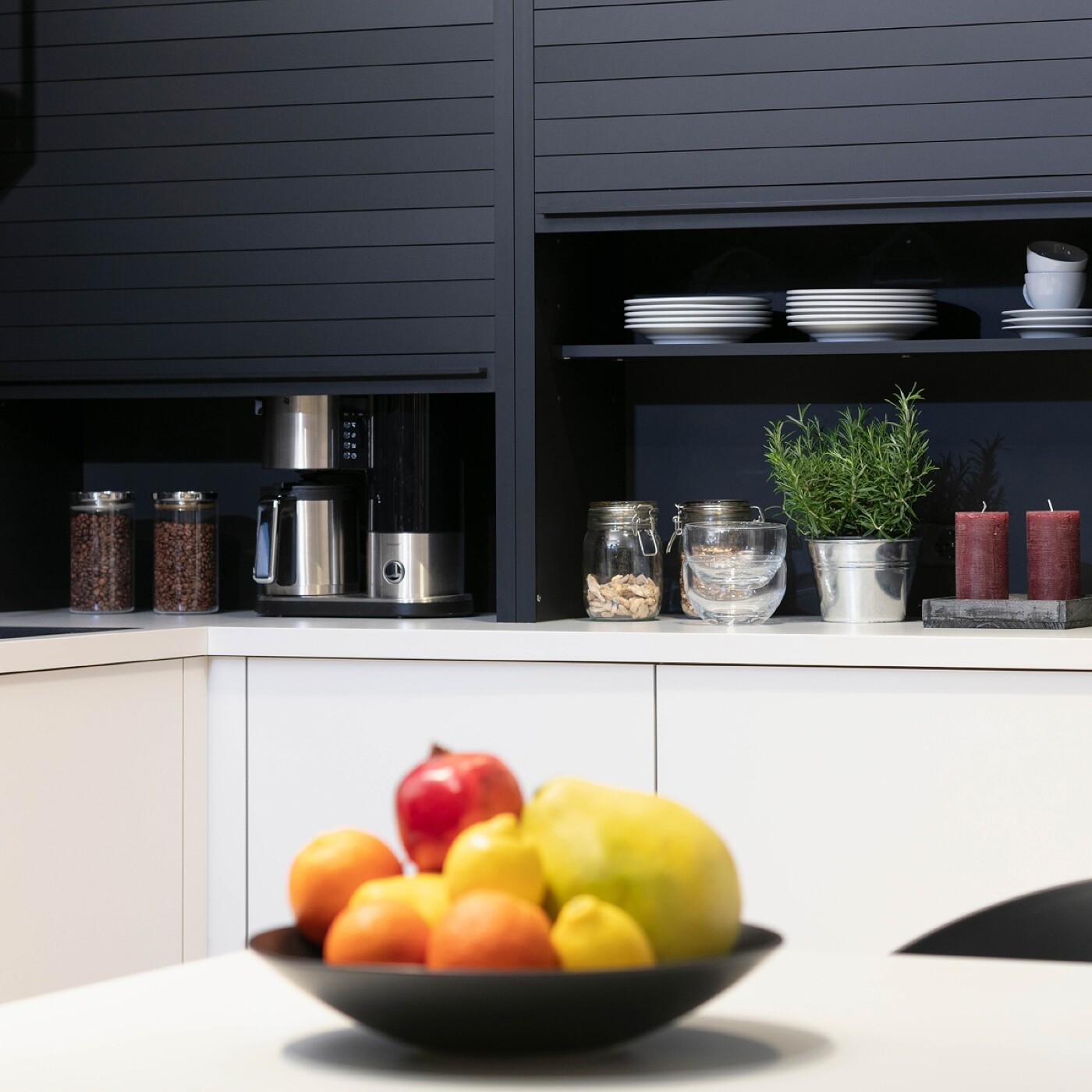 Die Alternative zur (oft elektrisch betriebenen) Klapptür ist die bewährte Jalousie: Die Lamellen solcher Rolladenschränke gibt es in vielen Farben. Aus Glas gefertigt sind sie auch semitransparent zu haben und können in Ihrer Wunschfarbe hinterlackiert und somit perfekt an Ihre Küche angepasst werden.