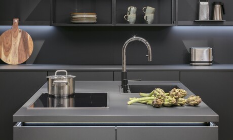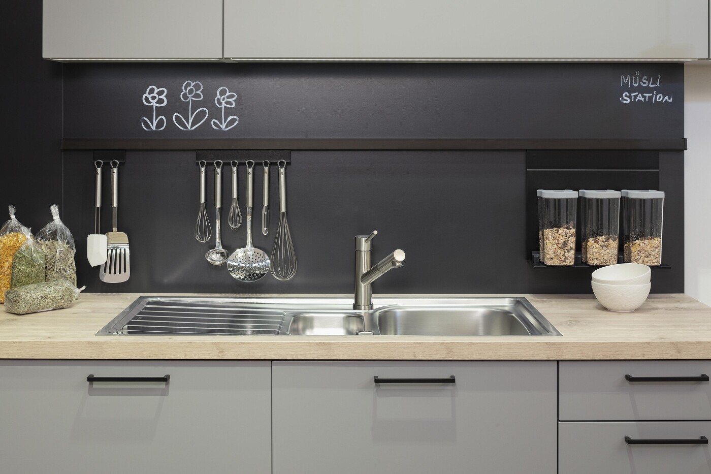 Nischenrückwände müssen weder glänzen, noch hell sein. In mattem Schwarz strahlen sie eine besondere Tiefe aus und verleihen der Küche sofort auch mehr Eleganz. Wenn Sie es wünschen, lassen sich bei dieser Farbgebung auch beschreibbare Oberflächen einsetzen. In jedem Fall sind diese genauso leicht zu reinigen wie andersartige Spritzschutz-Materialien. Kommen Sie gerne einmal in unserem Küchenstudio vorbei und lassen sich von uns die unterschiedliche Gestaltungsmöglichkeiten vorführen. Die beiden Küchenfotos zeigen Ihnen schon mal zwei Beispiele, in welche Richtung es gehen kann, die Nischenrückwand entweder mit Reling oder Regalen zu bestücken.