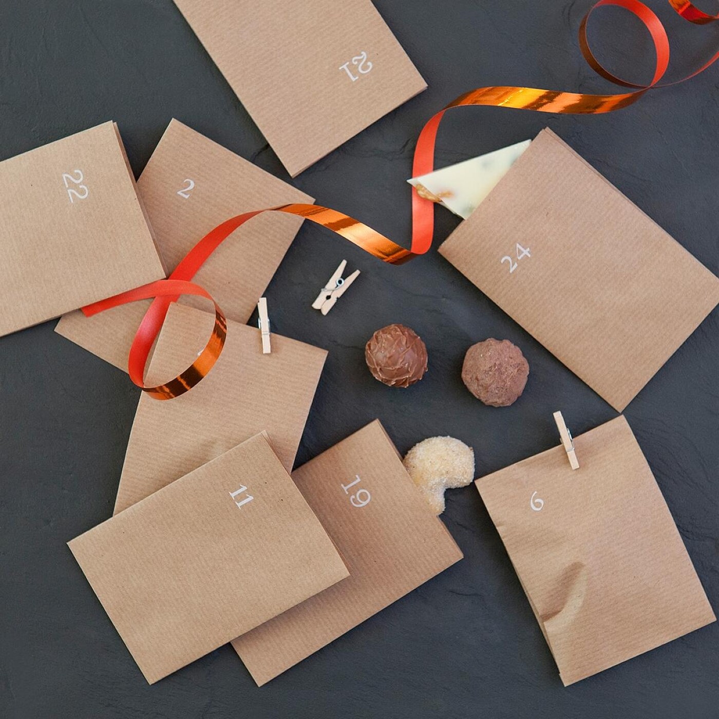 Wir haben eine ebenso einfache wie schöne Idee dafür: Nehmen Sie 24 gleiche kleine braune Papiertüten und füllen Sie sie mit immer, was Ihnen einfällt: mit Süßigkeiten, kleinen Geschenken, aufmunternden Worten, Gutscheinen.